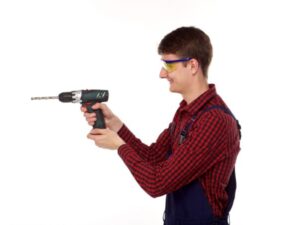 電動ドリルで穴明け作業を行うときは、写真のようにドリルを両手でしっかりと持って真っ直ぐドリルを当てなければなりません。