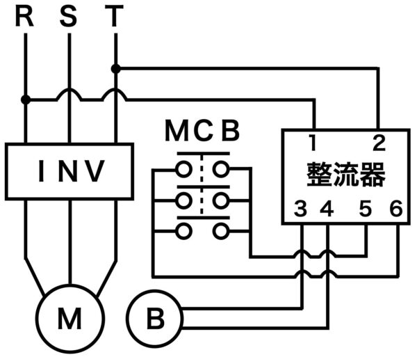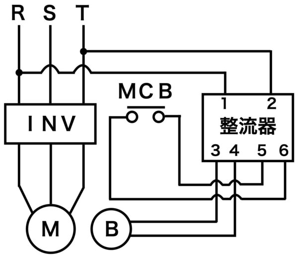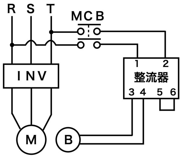 整流器が盤の中にあるか、モーターの端子箱の中にあるかでも変わってきますが、モーターの電源用配線とブレーキの電源用配線に加えて、ブレーキの直流回路を切るための配線も必要になります。