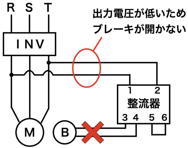 インバータの2次側にブレーキの電源をつないでしまうと、ブレーキが開かないというトラブルが発生するよ