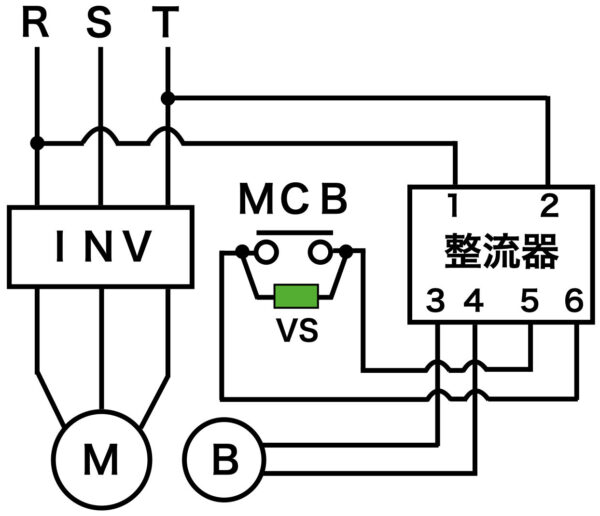つまり直流切りは、上の図の⑤ー⑥間の端子に電磁接触器(MC)の補助接点等を接続することによって、ブレーキに流れる直流の電気を直接入り切りする結線方法です。