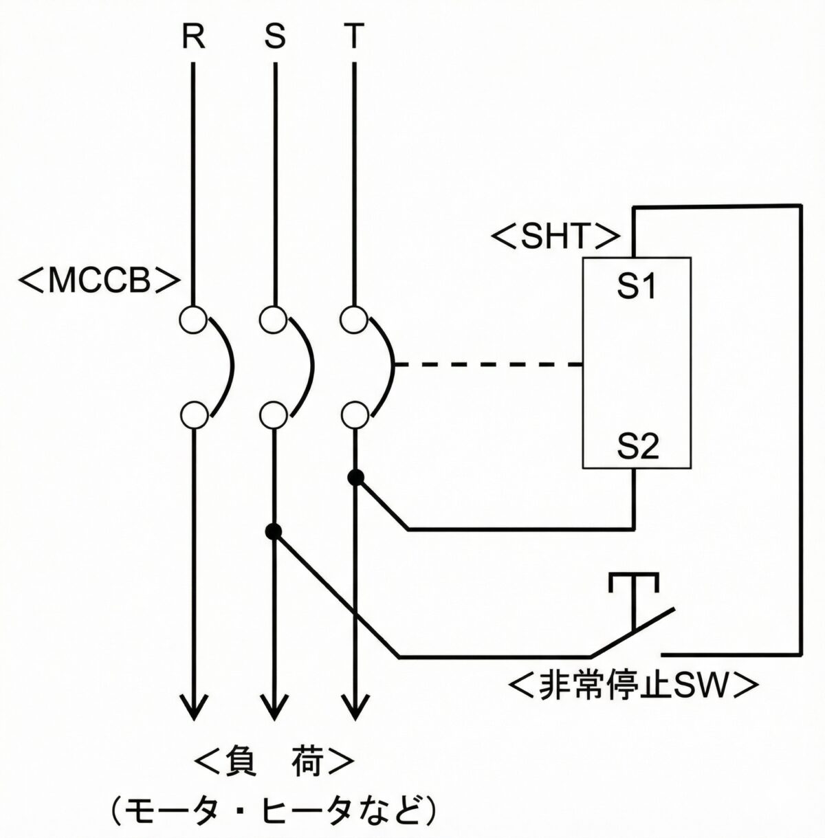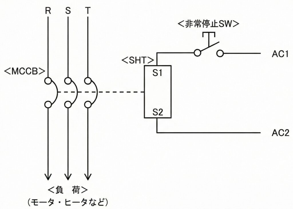 この仕組みを上手に利用することで、離れたところからボタンを押してブレーカを即座にトリップできる非常停止回路を構築することができます。