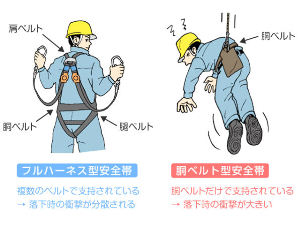 ちなみに、近年の法改正によって、高さ6.75m以下もしくはフルハーネス型だと地面に衝突してしまう場合を除いて、胴ベルト型ではなくフルハーネス型の使用が義務化されています。