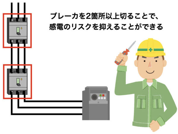 二重切りとは、設備のブレーカを1箇所だけ切るのではなく、2箇所以上切ることで安全性をより高めるための処置をいいます。