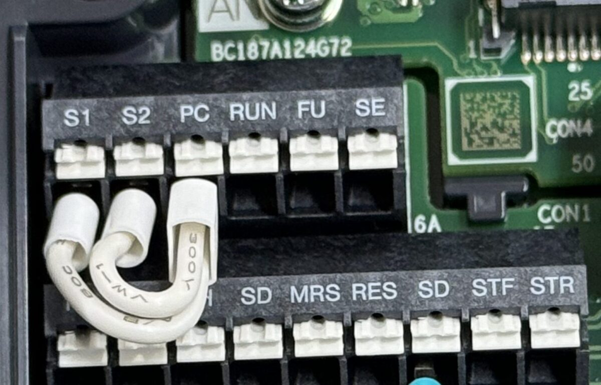 このシリーズのインバータは制御線の配線部分が差し込み式端子台となっています。