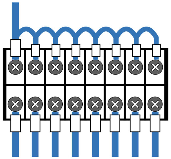 一方で、フェルール端子で接続する差し込み式の端子台については、上図のような端子間を渡る配線が行いにくいというデメリットがあります。