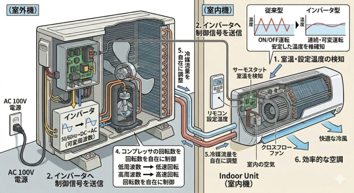 昔のエアコンは圧縮機のモーターをON・OFFのみで制御していたため、室内の温度を一定に保つなどの運転ができませんでした。