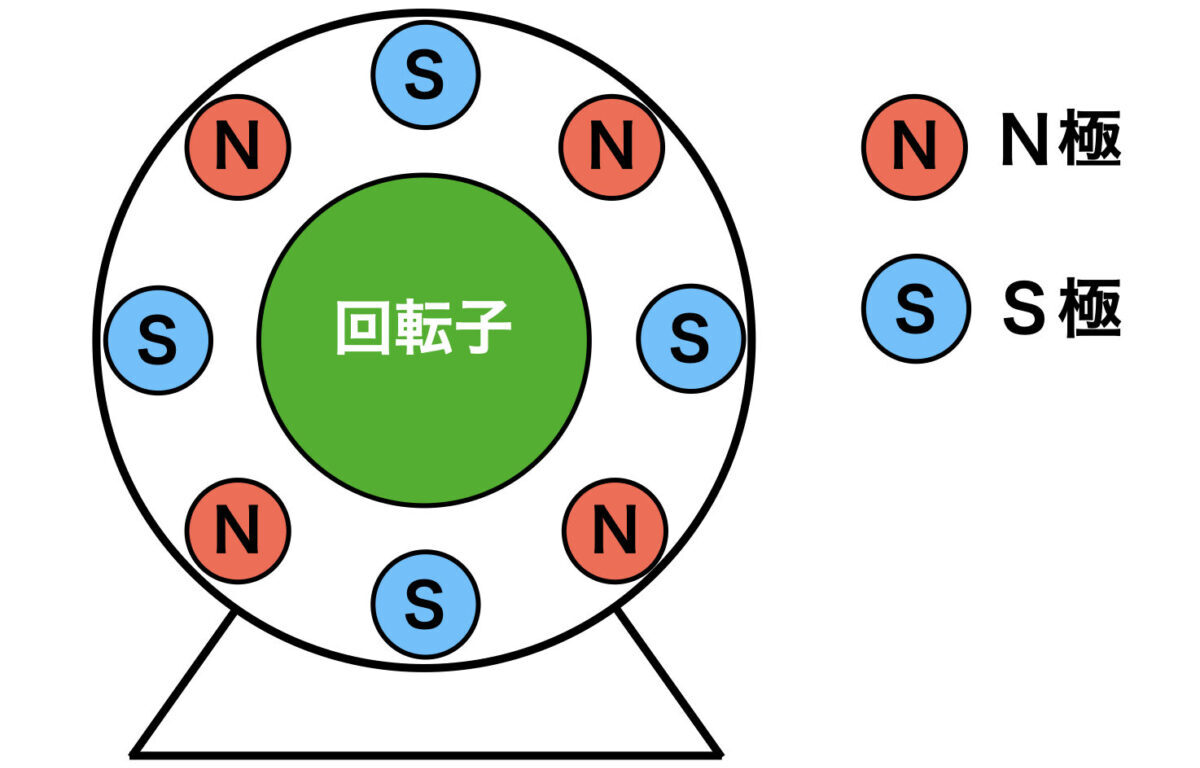 極数とはモーターの内部にある固定子の磁極(S極・N極)の数を表します。この固定子の数はモーターの仕様によって決まり、それに基づいてモーターが作られます。