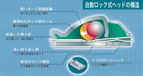 「ボールロック式」はヘッド部分の中にボールが組み込まれていて、バンドを挿入して引っ張るとボールが食い込んで強固にロックされるという仕組みになっています。