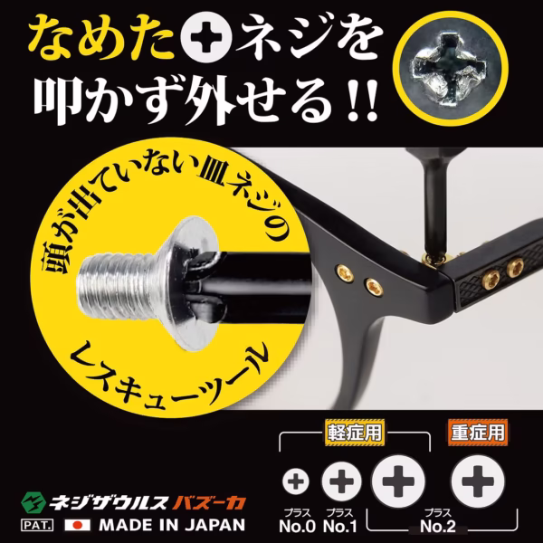ネジザウルスのネジバズーカーは、頭が出ていないネジの溝が潰れてしまった場合でも、先端の特殊形状によって内側に食い込んでネジを回すことができるという製品です。