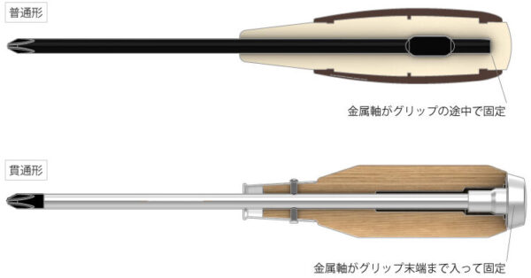 お尻の金属の部分がドライバー先端まで1本の軸で繋がっている構造なので、”貫通”ドライバーと呼ぶわけですね。