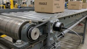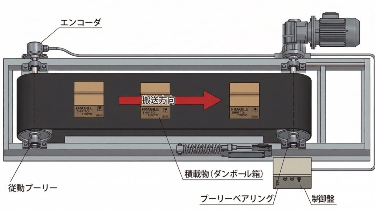 例えば、下の図のようなモータで駆動させているベルトコンベアの場合、ベルトで回る従動プーリーにエンコーダを取り付けることで、プーリーと一緒にエンコーダの軸も回転します。