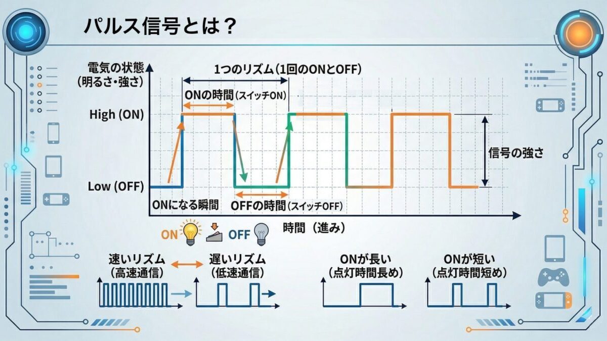 パルス信号とは短い間隔でON/OFFを繰り返す電気信号のことを言います。