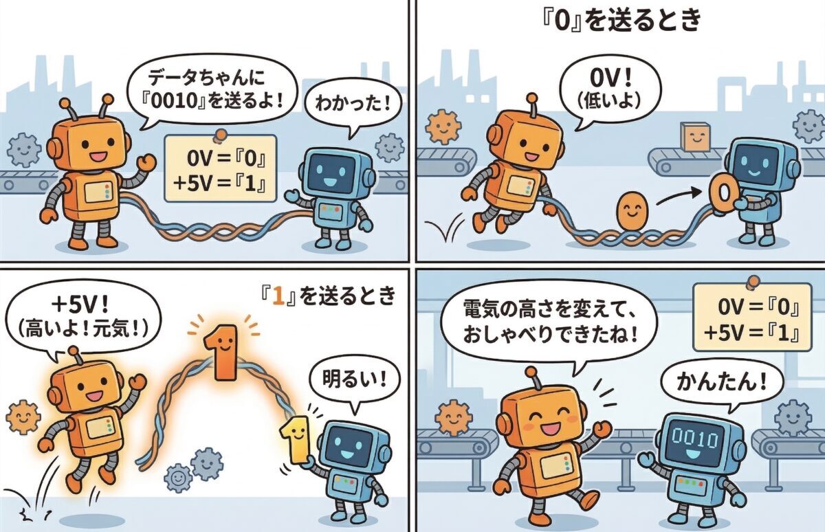 例えば、接続したケーブルに掛ける電圧が0Vなら「0」、+5Vなら「1」という風にルールを決めておき、「0・0・1・0・・・」という2進数のデータを電圧の上がり下がりで表現して伝達するといった具合ですね。