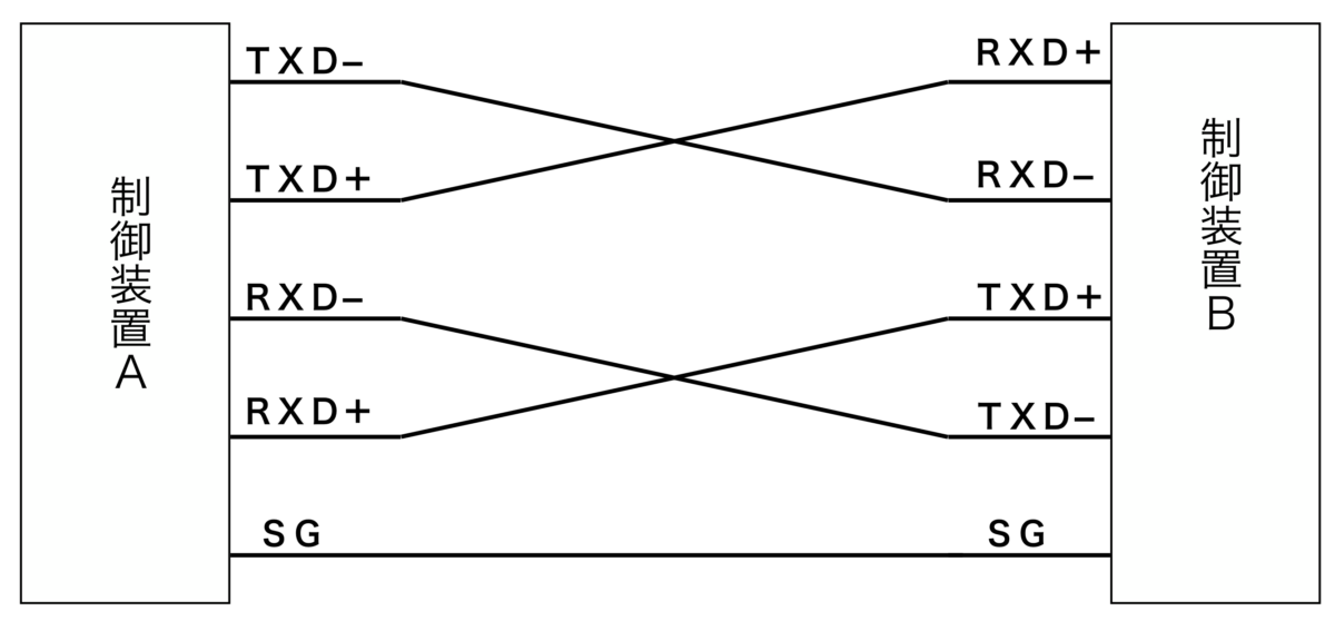 「TXD+」と「TXDー」はデータ送信、「RXD+」と「RXD−」はデータ受信、「SG」はシグナルグランドを表しています。