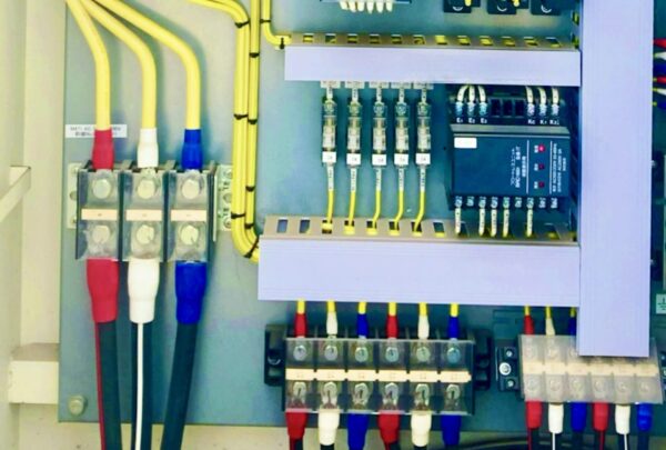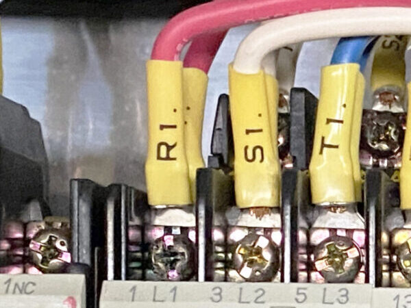 例えば上の写真では、各相の配線が「R相:赤色の線」・「S相:白色の線」・「T相:青色の線」を接続して、線番だけでなく配線の色でも相が判別できるようになっています。