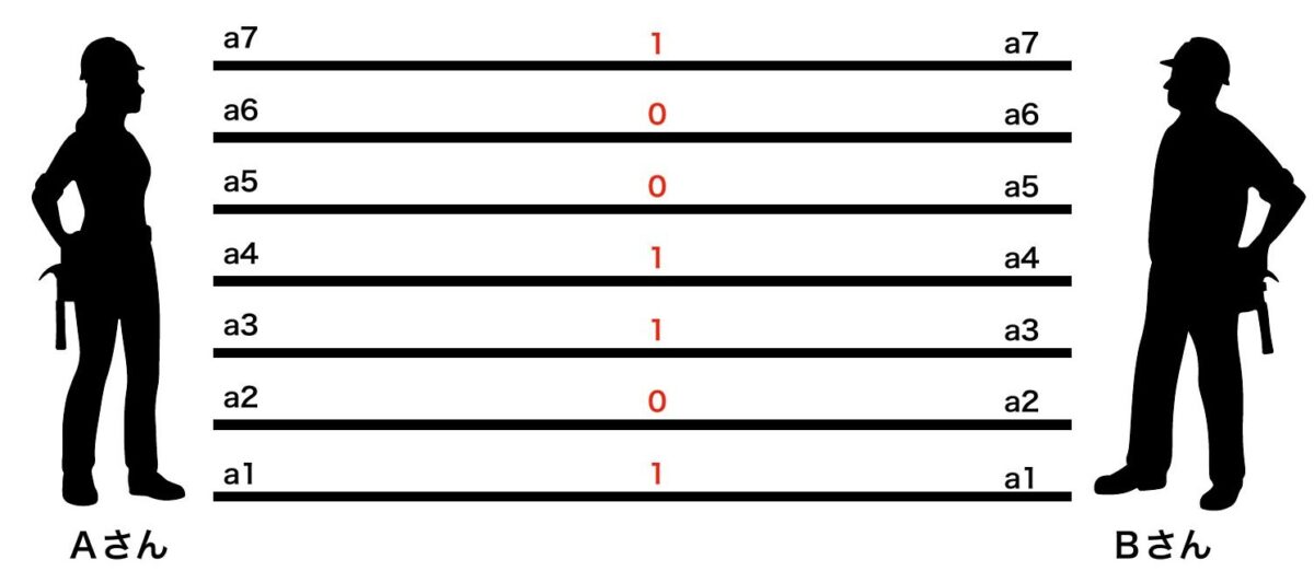 AさんとBさんが行った通信内容を見てみると、a1から順番に「1」・「0」・「1」・「1」・「0」・「0」・「1」となっています。