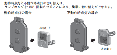 標準形リミットスイッチの動作表示灯の場合は、カバーを開けて中のランプホルダを上下入れ替えることで「動作時点灯」と「不動作字点灯」の切り替えが簡単に行えます。