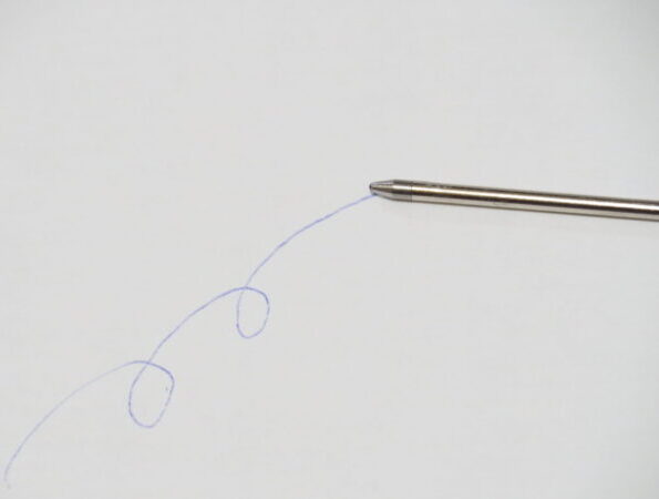 普通のミニボールペンと違って、中からインクを圧力で押し出すタイプの加圧式ボールペンなので、書いていてもインクが途切れにくく、逆さまの状態でもスムーズに筆記できる特徴があります。