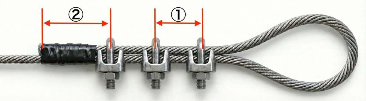 上の数値を目安に、ワイヤーロープ径に合わせた適正な間隔でワイヤークリップを取り付けるようにしましょう。