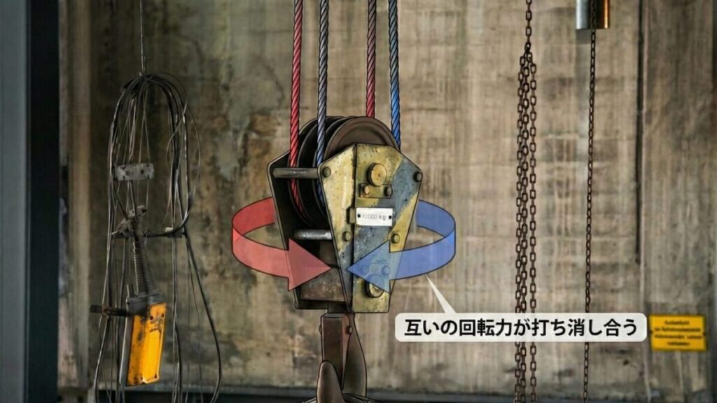 写真のフックは2本のワイヤーロープをフックのシーブに通して吊り上げていますが、2本のワイヤーロープをどちらも「Zより」もしくは「Sより」にしてしまうと、1方向にフックが回転してしまうという現象が発生します。